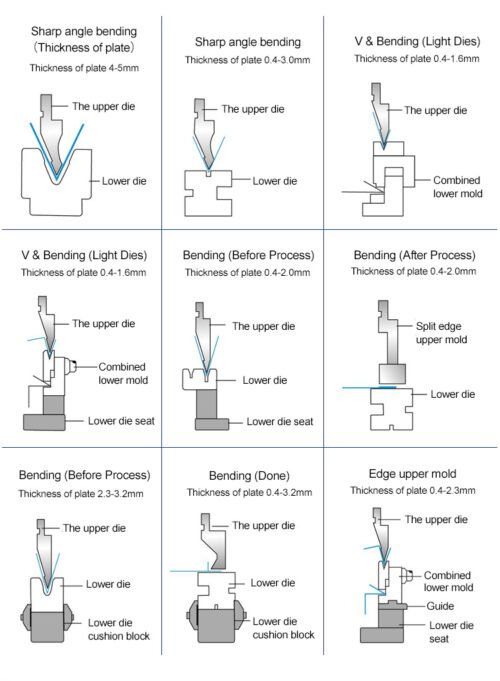 The press brake tool is comprised of two parts: the upper die (punch) and the lower die. The combination of these two dies, with their different shapes, acts upon the plate to form workpieces of various shapes.